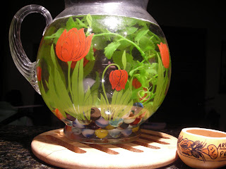 Here is a cool idea for a holiday gift. I know this is coming late, but a late gift is still a great gift. Go to a Goodwill or local thrift store and find yourself a cool pitcher like the one pictured here. Clean it and fill it with cool beads or marbles at the bottom and a cool fake plant. Last, fill it with fresh clean water ahead of time so the water reaches room temperature.